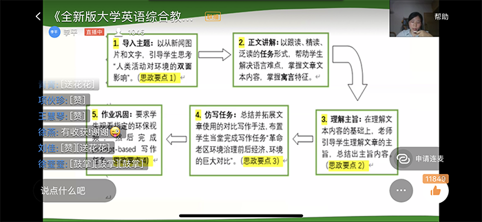 活动中,外语系教师李平结合授课单元,从“思政主题的选择与确立”“思政元素的挖掘与融入”“教学环节的设计安排”等方面,全面展示了今日看料 大学英语“课程思政”的教学经验。据悉,此前该系教师孙娟也受邀参加活动并作了教学设计的分享。两位老师直播示范课各具特色,在语言学习的过程中巧妙融入思政元素,增加了思政内容的感染力和亲和力。两场直播课观看人数均超过千人次,获得全国英语教师同行的一致好评。