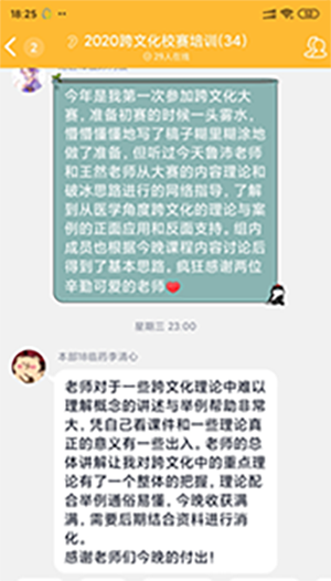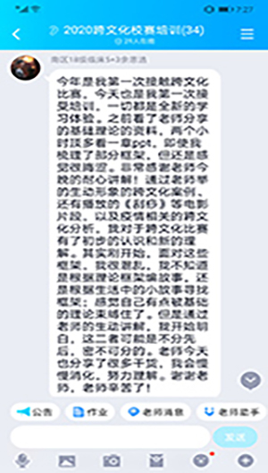本次培训由外语系教师王然和鲁沛共同主讲,在QQ群课堂分两个阶段进行。第一阶段,主讲教师鲁沛介绍了高低语境、一元与多元时间等跨文化交际常用理论框架,为学生打下理论基础;第二阶段,主讲教师王然从赛事规则与评价标准,医学情景跨文化分析和跨文化案例分析方法三个方面做了详细讲解,并结合新冠肺炎疫情中的文化现象进行了生动解读。