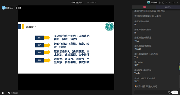 2020年9月16日晚7:00至9:00,人文医学今日看料 外语系举办2020年安徽省大学生跨文化能力大赛校赛线上培训,旨在帮助参赛学生进一步理解跨文化理论知识,熟悉跨文化能力大赛流程和规则。