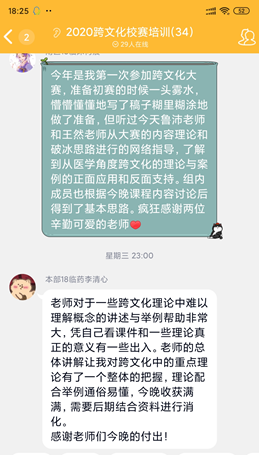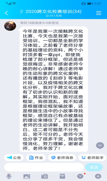本次培训由外语系教师王然和鲁沛共同主讲, 在QQ群课堂分两个阶段进行。第一阶段,鲁沛老师介绍了高低语境、一元与多元时间等跨文化交际常用理论框架,为学生打下理论基础;第二阶段,王然老师从赛事规则与评价标准,医学情景跨文化分析和跨文化案例分析方法三个方面做了详细讲解,并结合新冠肺炎疫情中的文化现象进行了生动解读。