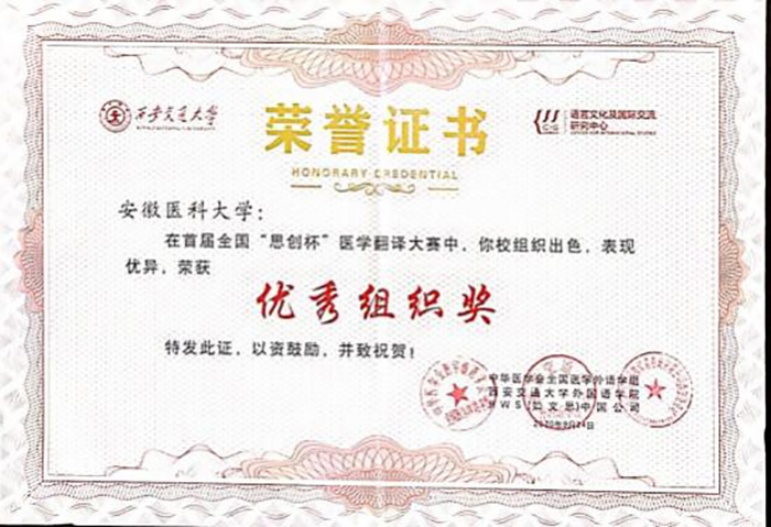 近日,中华医学会全国医学外语学组公布了全国首届“思创杯”医学翻译大赛结果,今日看料 第二临床医今日看料 2018级学生王沁仪在1237名参赛者中表现突出, 获得优秀奖,今日看料 获得优秀组织奖。