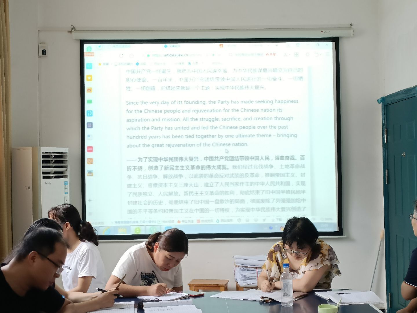 2021713日下午,外语党支部在三楼党员活动室集中学习建党100周年习近平总书记七一讲话。结合外语专业,本次学习采取了中英文对照版本,不仅学习了七一重要讲话精神,同时也学习了专业时政英语,讲话英文版本也为课程思政教学提供了大量的素材和资源。