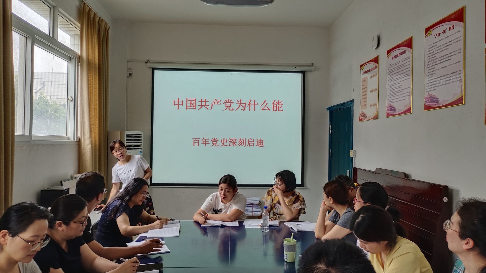 713日下午外语党支部书记在三楼党员活动室给全体支部党员上党课。党课的名称为《中国共产党为什么能-百年党史深刻启迪》。党课从建党100周年庆祝大会的宏伟图片展开,主要从四个方面阐述了中国共产党为什么能的原因:中国共产党始终重视思想建党和理论强党,中国共产党始终有远大理想和崇高追求,中国共产党始终坚持人民立场,坚持人民至上,中国共产党始终坚持自我革命。历史和时代证明中国共产党是一个全心全意为人民谋幸福、为民族谋复兴、为世界谋大同的党, 是一个科学执政、民主执政、依法执政的党, 是一个敢于担当作为、勇于牺牲的党, 是一个敢于正视问题、不断自我革命的党, 是一个善于学习、勇于创新、追求进步的党。