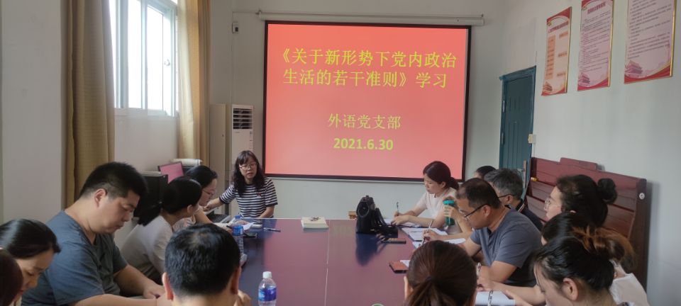 2021630日下午,外语党支部在三楼党员活动室集中学习《关于新形势下党内政治生活的若干准则》。首先,党支部书记带领全体党员认真学习了十二条准则。通过学习,全体党员清楚明白:全面从严治党永远在路上;全党要坚持不懈努力,共同营造风清气正的政治生态,确保党始终成为中国特色社会主义事业的坚强领导核心。其后,王然,薛艳,张禄静三位党员就学习的准则内容,分别发言,表达了自己的看法和遵守准则的决心。