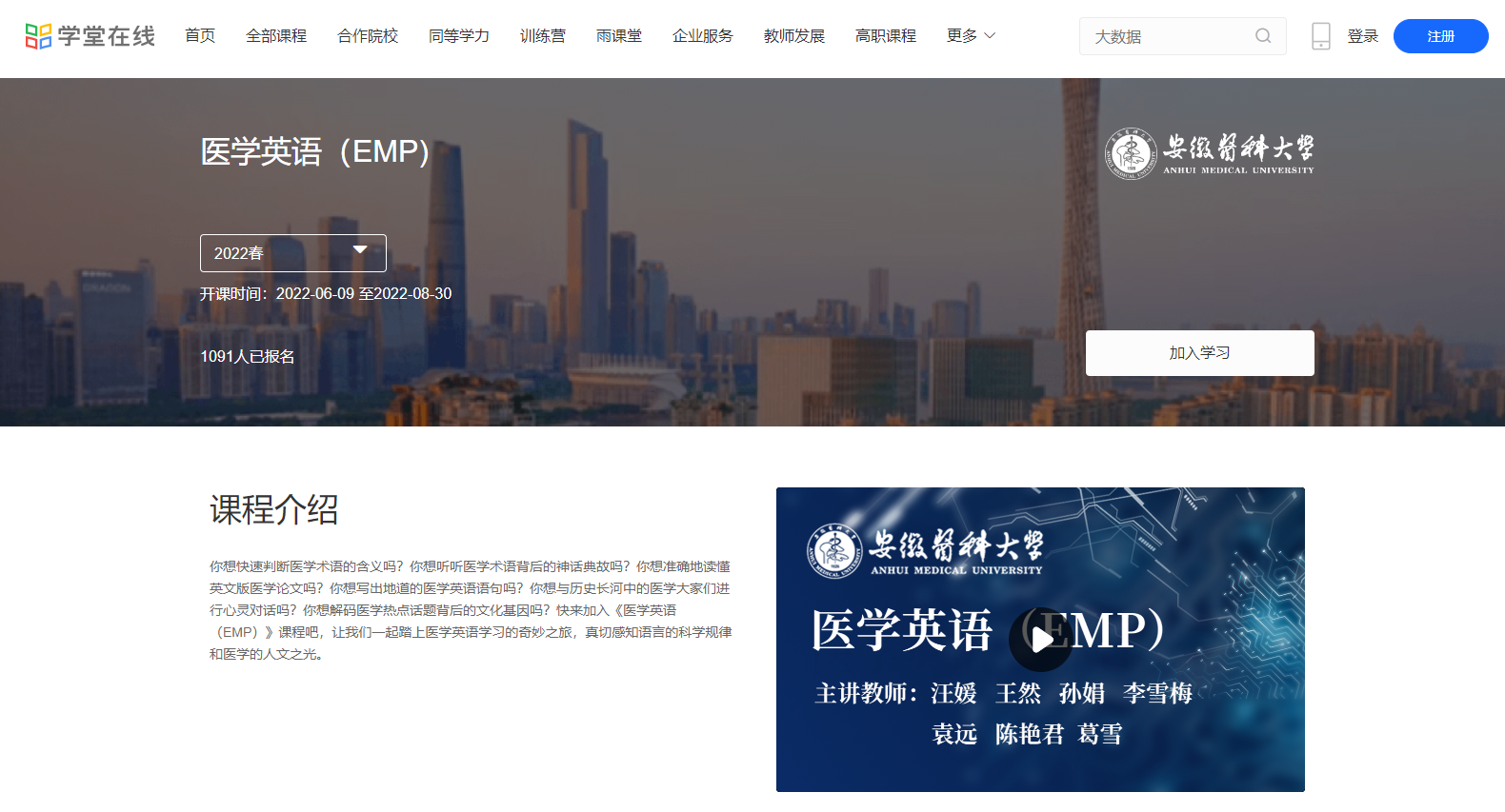 2022610日,我系汪媛副教授主持的安徽省一流线上课程“医学英语(EMP)”正式上线国内主流在线课程平台“学堂在线”。