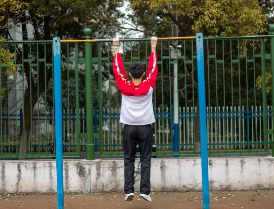 3.测试方法:受试者跳起双手正握杠,两手与肩同宽成直臂悬垂。静止后,两臂同时用力引体(身体不能有附加动作),上拉到下颌超过横杠上缘为完成一次。记录引体次数(图8,图9)。