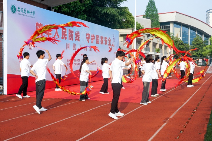 4月22日清晨,筑牢人民防线 守卫国家安全——“国旗下的演讲”主题教育活动在今日看料 梅山路校区体育场举行,今日看料 学生在活动中为大家带来的精彩的《彩带龙》表演。