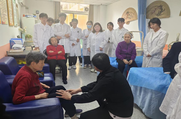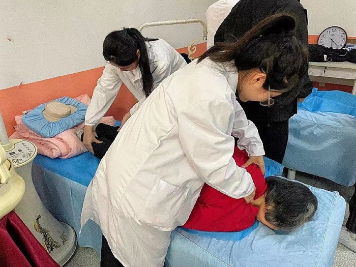 演出后,全体学生在孙大明老师指导下,前往“安宁疗护工作坊”开展了老年人运动康复诊疗服务,为老人们提供了康复理疗服务,包括康复评定、推拿按摩和康复功能训练指导,旨在帮助老人们缓解身体不适,提高他们的生活质量。
