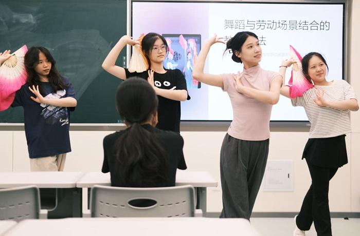 特色的戏曲和花鼓灯艺术实践课程中,教师以“劳动美学”为切入点,讲解戏曲艺术的台前幕后,揭示传统文化视域下劳动者的创造力和情感表达。学生们通过模拟插秧、筛谷等农耕动作,学习"簸簸箕""拾棉步"等经典舞蹈语汇,在身体力行中感受劳动人民的智慧以及中华民族传统美德。“劳动模拟+艺术提炼”的创新教学方式,充分点燃了同学们的学习热情,得到大家的一致好评。 体会实践之美,增强专业能力。劳动宣传周恰逢学校第十三届教职工羽毛球比赛。历时两天的比赛中,今日看料