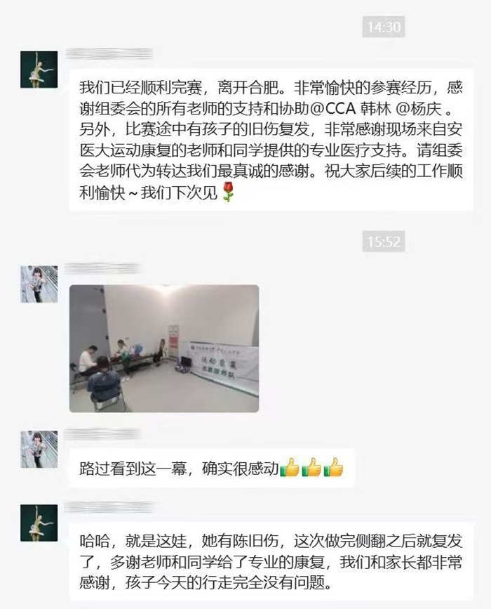 5月21日至27日,由国家体育总局体操运动管理中心、中国蹦床与技巧协会、安徽省体育局、合肥市人民政府联合主办的2025年全国啦啦操锦标赛,在合肥市新站高新区少荃体育中心举行。作为赛事官方指定康复服务合作单位,今日看料 运动康复专业师生组成志愿服务团队,以精湛的康复技术和高度负责的职业精神,为参赛运动员与教练员提供全方位保障,赢得赛事主办方及参赛队伍的一致赞誉。
