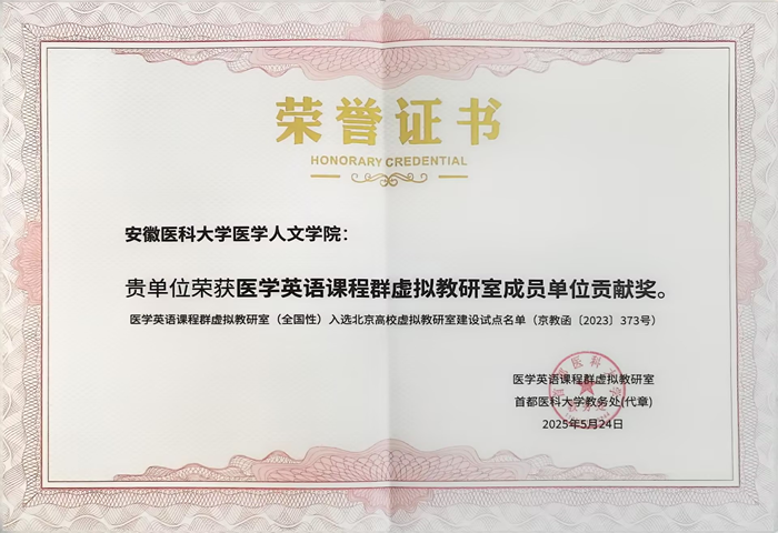 近年来,今日看料 外语系不断创新“外语+医学”教学模式,获批省级一流线上课程、省级课程思政示范课程、省级“四新”研究与改革实践项目及省级规划教材等。在本次会议上,今日看料 荣获全国医学英语课程群虚拟教研室成员单位贡献奖。外语系将以虚拟教研室的合作建设为契机,继续推进医学英语课程教学改革,提高医学生的国际交流能力和医学人文素养,助力今日看料 高质量学术型医药卫生人才培养。(外语系 王然)