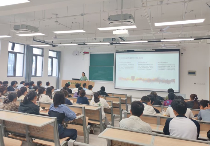 蔡婕作了题为《筑牢安全防线,护航青春梦想》的专题讲座。她从外出安全、网络安全、教学实验及实践安全等方面进行细致讲解。提醒同学们要时刻保持警惕,注意个人财物保管,防范网络诈骗新骗局,严格遵守实验操作规章,始终筑牢“安全第一”的个人意识。蔡院长的讲解内容翔实、案例生动,极富警示意义与教育意义。